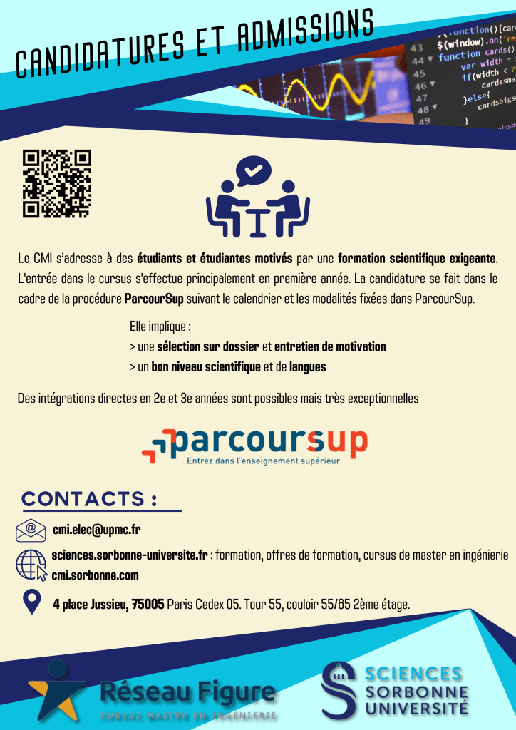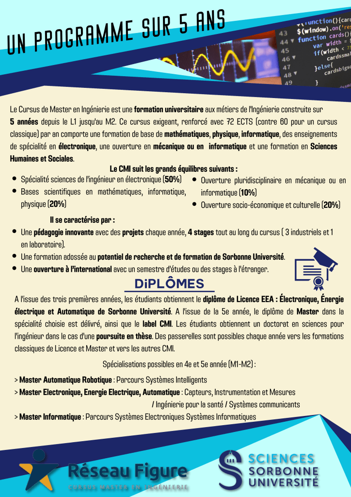 La spécialité d’Electronique proposée par le cursus CMI permet aux étudiants de découvrir les fondements de l’électronique ainsi que ces différentes applications. Elle comporte également des notions d’électromagnétisme nécessaire à la compréhension de certains phénomènes physiques. En bonus, cet enseignement inclus des projets en électronique pour préparer au monde professionnel.