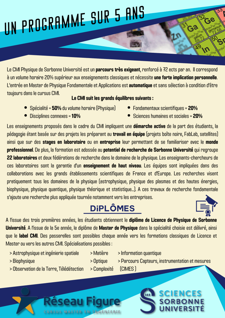 La spécialité Physique du CMI a pour but d’amener une maîtrise de l’ensemble des aspects du métier d’ingénieur et de chercheur. Pour cela, nous allons étudier la capacité à mettre au point un projet de haut niveau et de le suivre tout au long de son exécution, que ce soit du côté scientifique, technique, économique ou humain.